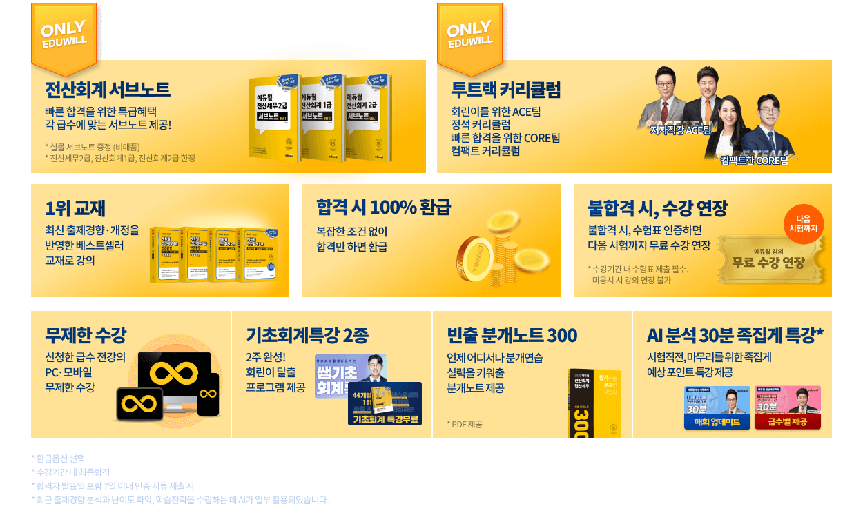 전산세무회계 환급상품 선택 시 아래의 환급혜택이 적용됩니다. 1. 수강료 환급조건 전산세무회계 '초단기 챡 합격패스' 100% 환급 상품을 신청 -> 수강기간 내 전산세무회계 시험에 응시 및 최종 합격하고, 합격자 발표일 포함 7일 이내 환급 인증 서류 제출시 100% 수강료 환급 ※ 최초 수강기간 내 응시한 시험에 합격할 경우에만 환급이 가능합니다. 수강기간 연장 시에는 환급혜택이 적용되지 않습니다. 2. 환급 신청절차 [환급 신청] : 공지사항에 게시된 안내에 따라 환급 신청을 합니다. ※ 기한 내 인증하지 않으시면 환급이 불가능합니다. ※ 환급 신청 기간을 별도로 안내하지는 않습니다. 3. 환급액 산정 실 결제한 금액에서 PG사 수수료 3% 공제 후, 제세공과금 22% 공제한 금액이 환급됩니다. 교재를 함께 구매한 경우 교재금액은 제외하고 환급됩니다. ※ 환급은 하단의 '4. 유의사항'에 있는 조건들을 충족한 경우에만 적용됩니다. 4. 유의사항 1) 수강료 환급 신청은 최초 수강기간 내 응시한 시험에 한해 적용됩니다. 2) 시험을 미응시한 경우에는 환급이 불가합니다. 3) 최종합격 발표일을 포함해 7일 이내, 환급공지에 안내된 수험카페에 및 에듀윌 시험후기/합격수기 게시판에 합격 수기를 작성한 후 신청해야합니다. 4) 합격 인증자료는 '초단기 챡 합격패스' 구매 아이디/합격 확인서/본인신분증 사본의 이름(실명)이 동일할 경우에 적용됩니다. 5) 환급 신청 접수 후에는 잔여 수강기간에 관계없이 수강기간이 종료됩니다. |