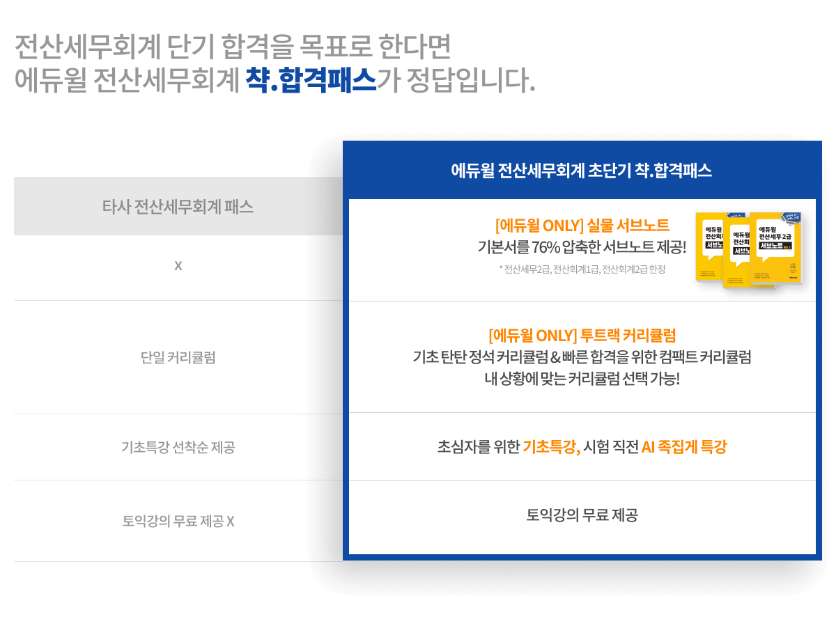 · 초단기 챡 합격패스 : 전산회계2급, 전산회계1급, 전산세무2급, 전산세무1급 中 신청한 급수 대비 강의 · 몽땅합격 프리패스 : 전산회계2급, 전산회계1급, 전산세무2급, 전산세무1급 모두 제공 |