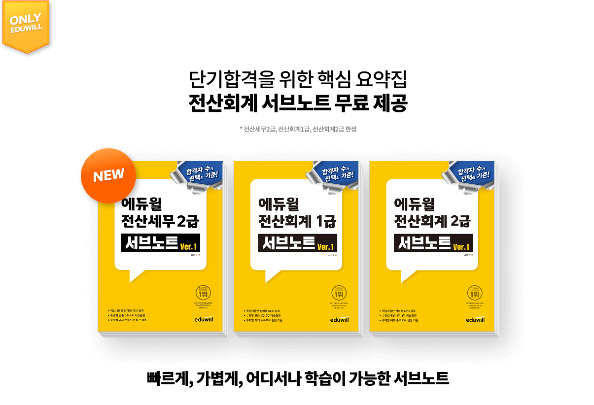 전산세무2급, 전산회계1급, 전산회계2급 대비 패스 신청 시, '서브노트'가 제공됩니다. 대상상품/서브노트 · 전산세무2급 대비 : 전산세무2급 서브노트 · 전산회계1급 대비 : 전산회계1급 서브노트 · 전산회계2급 대비 : 전산회계2급 서브노트 · 몽땅합격 프리패스 : 전산세무2급, 전산회계1,2급 서브노트 |