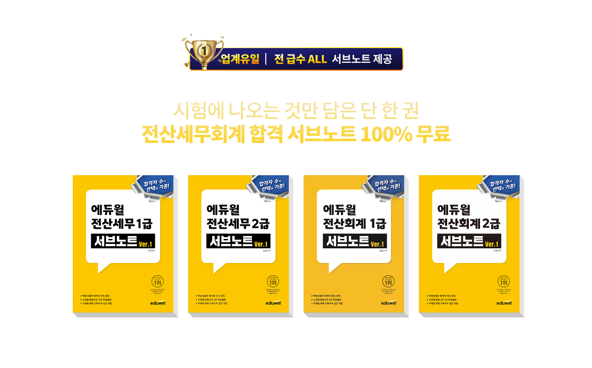 전산세무1급, 전산세무2급, 전산회계1급, 전산회계2급 대비 패스 신청 시, '서브노트'가 제공됩니다. 대상상품/서브노트 · 전산세무1급 대비 : 전산세무1급 서브노트 · 전산세무2급 대비 : 전산세무2급 서브노트 · 전산회계1급 대비 : 전산회계1급 서브노트 · 전산회계2급 대비 : 전산회계2급 서브노트 · 몽땅합격 프리패스 : 전산세무1,2급, 전산회계1,2급 서브노트 ※ 전산세무1급 서브노트는 12/31 출간 후 순차 발송됩니다. |